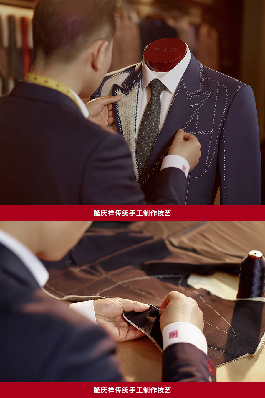 隆慶祥以量身定制為核心特色,提供從面料選擇、款式設計到工藝優化、售后服務的全程服務,產品均為“單人單版、單版單裁、單裁單做”,以獨一無二的專屬性彰顯尊貴榮耀。每套西裝定面料、定款式、制版、裁剪、制作、試樣、后道整理、取件共八道工序,均采用406道工序,而且大量工序是手工制作。產品均“單人單版、單版單裁、單裁單做”,以獨一無二的專屬性彰顯尊貴榮耀。
