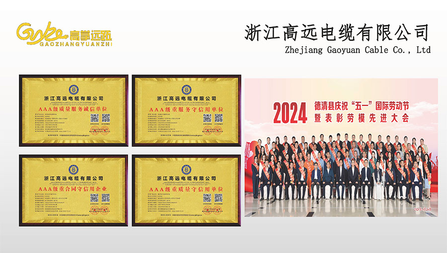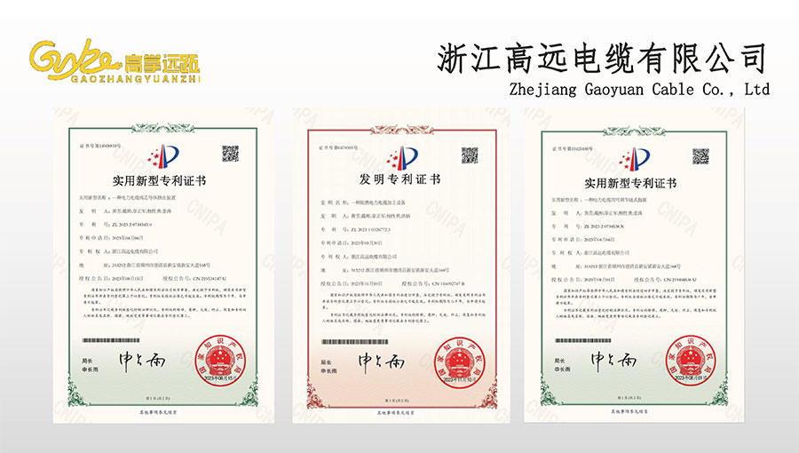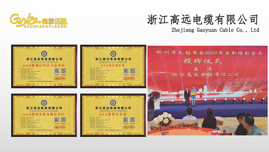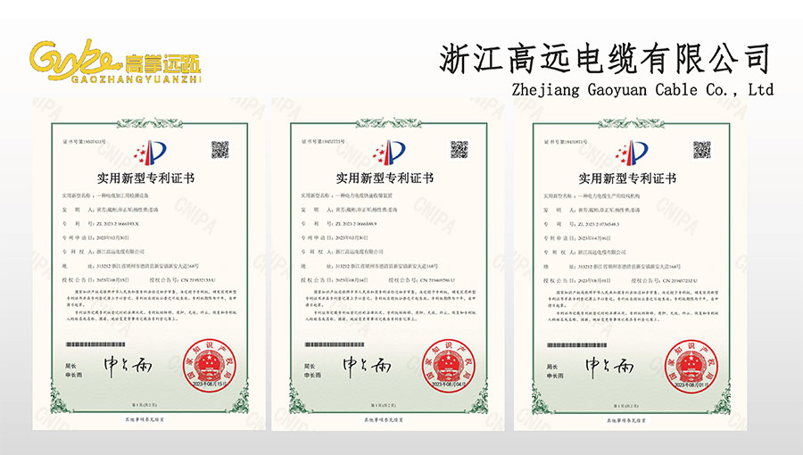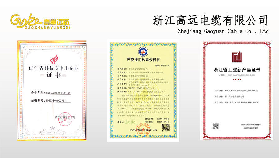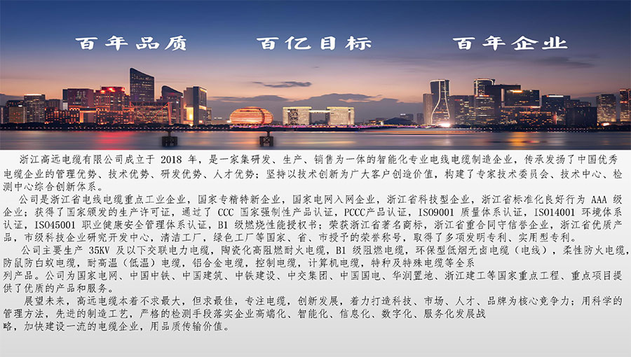 高遠(yuǎn)電纜是浙江省電線電纜重點(diǎn)工業(yè)企業(yè),浙江省專(zhuān)精特新企業(yè)、浙江省科技型企業(yè),浙江省標(biāo)準(zhǔn)化良好行為AAA級(jí)企業(yè);獲得了國(guó)家頒發(fā)的生產(chǎn)許可證,通過(guò)了CCC國(guó)家強(qiáng)制性產(chǎn)品認(rèn)證,ISO9001質(zhì)量體系認(rèn)證,ISO14001環(huán)境體系認(rèn)證,OHSAS18001職業(yè)健康安全管理體系認(rèn)證,PCCC產(chǎn)品認(rèn)證、B1級(jí)燃燒性能授權(quán)書(shū);榮獲浙江省著名商標(biāo),浙江省重合同守信譽(yù)企業(yè),浙江省優(yōu)質(zhì)產(chǎn)品,市級(jí)研究開(kāi)發(fā)中心,清潔工廠,綠色工廠等國(guó)家、省、市授權(quán)的榮譽(yù)稱(chēng)號(hào),取得了多項(xiàng)發(fā)明專(zhuān)利、實(shí)用型專(zhuān)利。