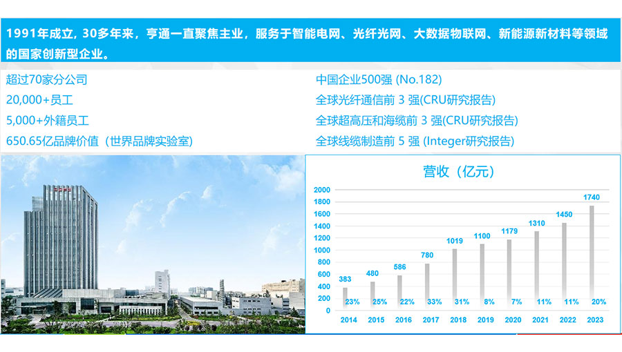 江蘇亨通電力電纜有限公司是亨通集團旗下的一家國家級重點高新技術企業,注冊商標“亨通光電”,注冊資金185168萬元,成立于1995年,目前員工總數為一千余人??梢匝邪l制造220kV及以下交聯電力電纜、防火電纜、光纖復合電纜、光伏電纜、鋁合金電纜、電氣裝備電纜、控制電纜、低壓電線等產品,可滿足電力、通信、交通、冶金、石油石化、煤炭、船舶、軍工等不同行業、地區和國家客戶的差異化需求。