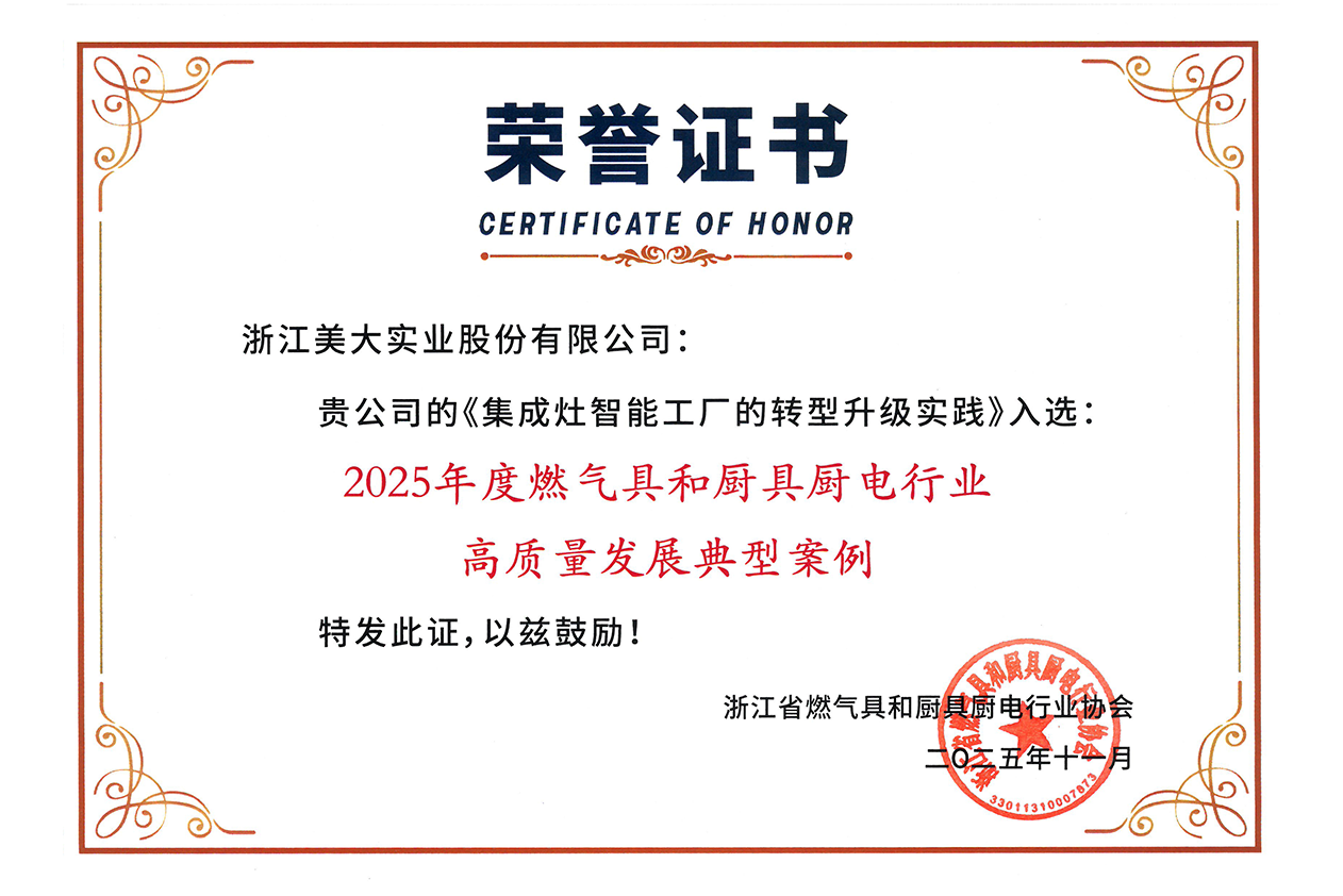 此次,浙江美大榮獲兩大“高質量發展典型案例”,不僅體現了行業對美大技術研發實力與智能制造水平的高度認可,更標志著美大在推動廚電產業向“高質量、智能化、綠色化”轉型升級過程中邁出了堅實一步,具有重要的示范意義。
