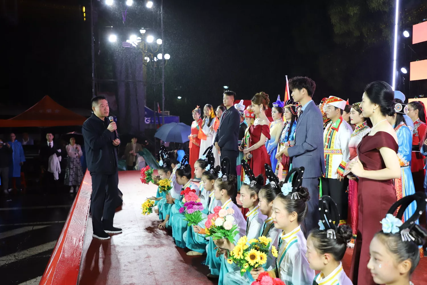 現場搭建的舞臺被五彩燈帶環繞,背景板上“慶國慶、迎中秋、頌祖國”九個大字格外醒目。村民們早早趕來,有的撐著花色雨傘,有的披著雨衣,孩子們被家長抱在肩頭,小臉蛋上貼著小紅旗貼紙,老人們搬來小板凳,即便雨水打濕了褲腳,眼神里依舊滿是期待。大家擠在舞臺前,用熾熱的目光、攥緊的小國旗,將微涼的雨夜,變成了一片為祖國慶生的溫暖海洋。